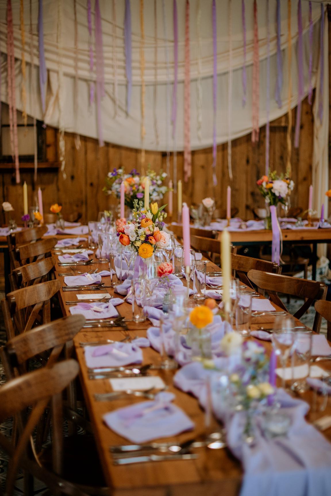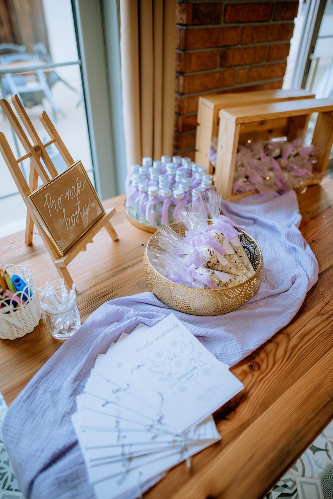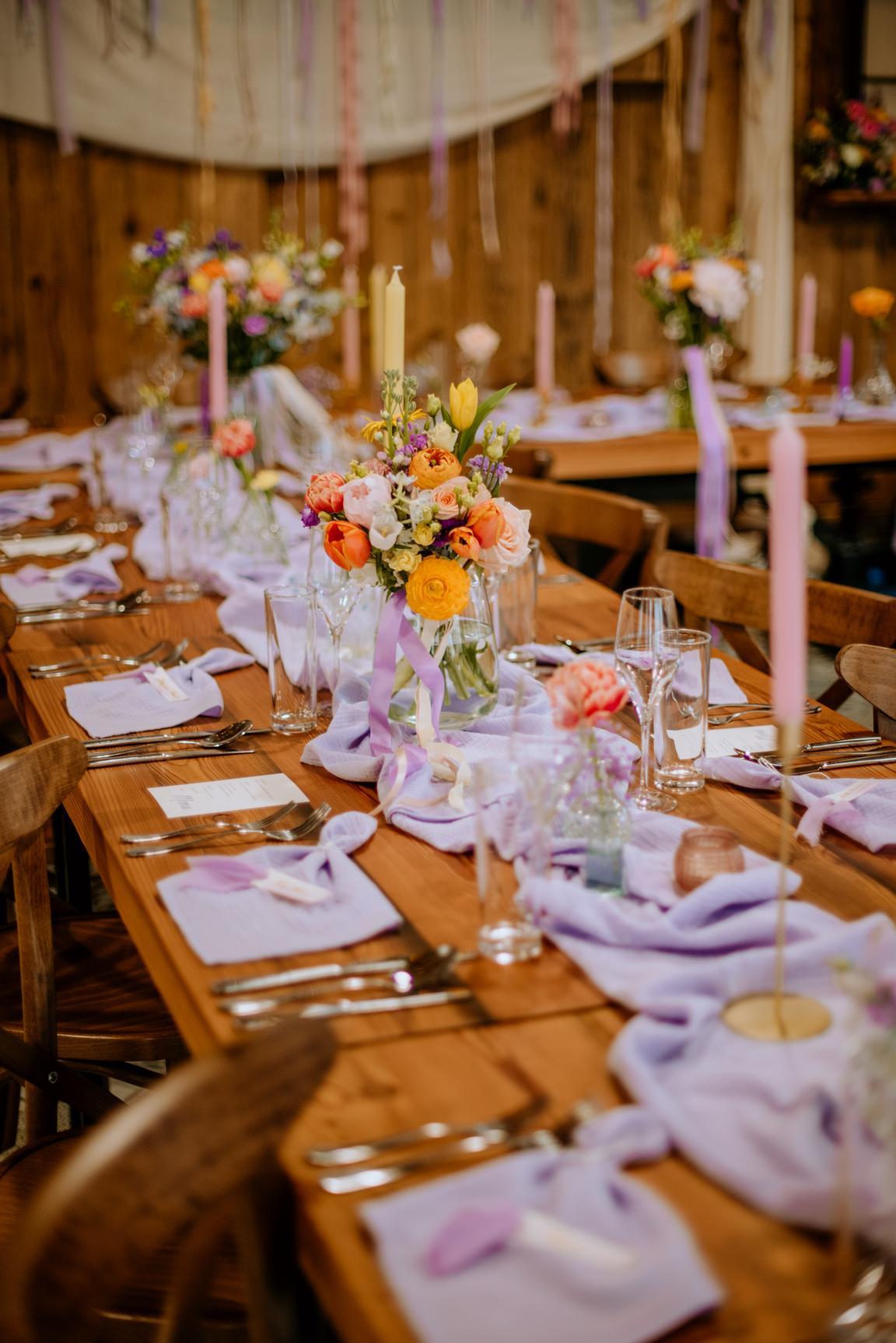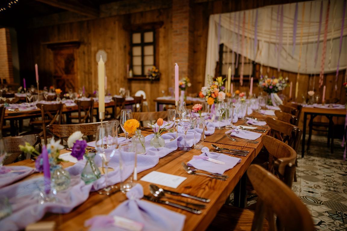 Lila běhouny a ubrousky. Zlaté a skleněné barevné svícny.